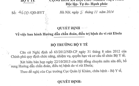 Quyết định 4600/QĐ-BYT ngày 05/11/2014 hướng dẫn chẩn đoán, điều trị bệnh do vi rút Ebola do Bộ trưởng Bộ Y tế ban hành