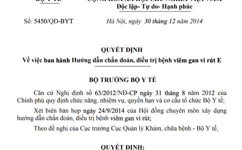Quyết định 5450/QĐ-BYT ngày 30/12/2014 Hướng dẫn chẩn đoán, điều trị bệnh viêm gan vi rút E do Bộ trưởng Bộ Y tế ban hành