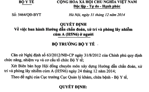 Quyết định 5464/QĐ-BYT ngày 31/12/2014 hướng dẫn chẩn đoán, xử trí và phòng lây nhiễm cúm A (H5N6) ở người do Bộ trưởng Bộ Y tế ban hành