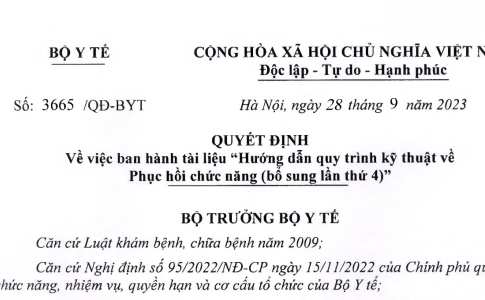 Quyết định 3665/QĐ-BYT năm 2023 tài liệu "Hướng dẫn quy trình kỹ thuật về Phục hồi chức năng (bổ sung lần thứ 4)" do Bộ trưởng Bộ Y tế ban hành