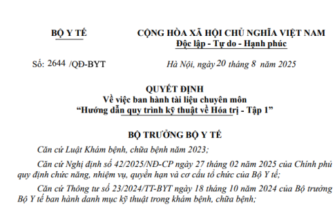 Quyết định 2644/QĐ-BYT năm 2025 về Tài liệu chuyên môn “Hướng dẫn quy trình kỹ thuật về Hóa trị - Tập 1” do Bộ trưởng Bộ Y tế ban hành
