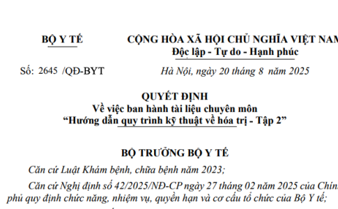 Quyết định 2645/QĐ-BYT năm 2025 về Tài liệu chuyên môn “Hướng dẫn quy trình kỹ thuật về hóa trị - Tập 2” do Bộ trưởng Bộ Y tế ban hành