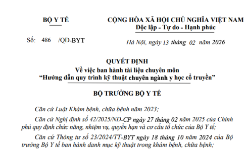 Quyết định 486/QĐ-BYT năm 2026 về Tài liệu chuyên môn "Hướng dẫn quy trình kỹ thuật chuyên ngành y học cổ truyền" do Bộ trưởng Bộ Y tế ban hành