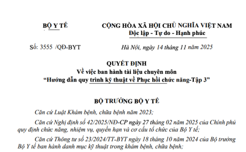 Quyết định 3555/QĐ-BYT năm 2025 về Tài liệu chuyên môn “Hướng dẫn quy trình kỹ thuật về Phục hồi chức năng - Tập 3” do Bộ trưởng Bộ Y tế ban hành