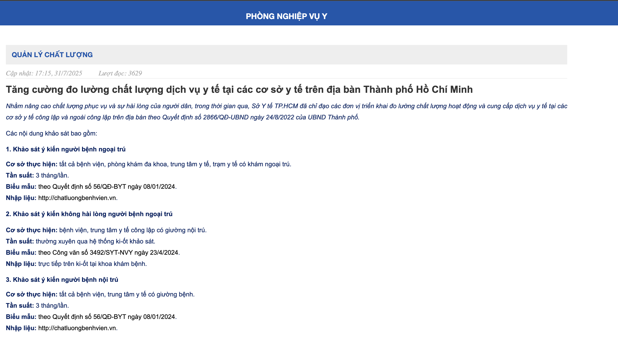 Nhằm nâng cao chất lượng phục vụ và sự hài lòng của người dân, trong thời gian qua, Sở Y tế TP.HCM đã chỉ đạo các đơn vị triển khai đo lường chất lượng hoạt động và cung cấp dịch vụ y tế tại các cơ sở y tế công lập và ngoài công lập trên địa bàn theo Quyết định số 2866/QĐ-UBND ngày 24/8/2022 của UBND Thành phố.