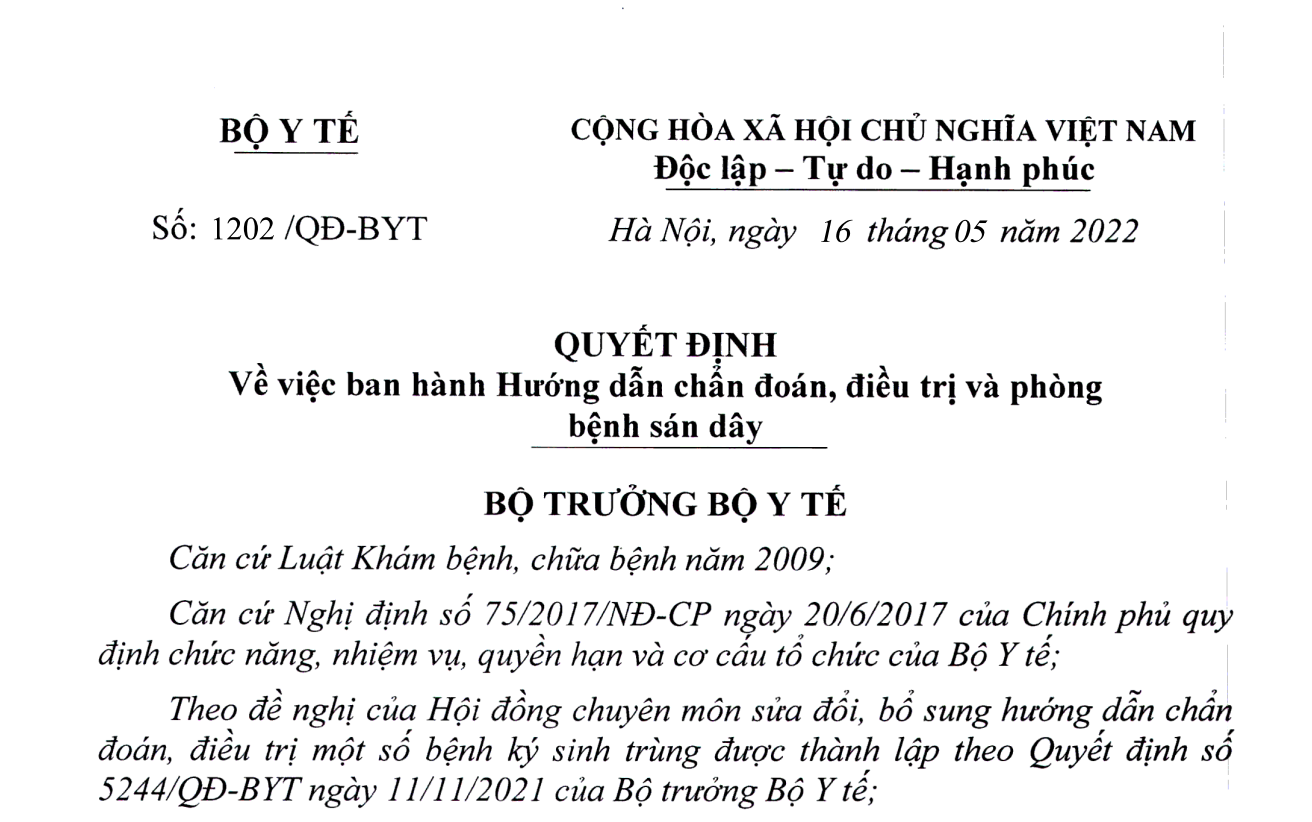 Theo đề nghị của Hội đồng chuyên môn sửa đổi, bổ sung hướng dẫn chẩn đoán, điều trị một số bệnh ký sinh trùng được thành lập theo Quyết định số 5244/QĐ-BYT ngày 11/11/2021 của Bộ trưởng Bộ Y tế;