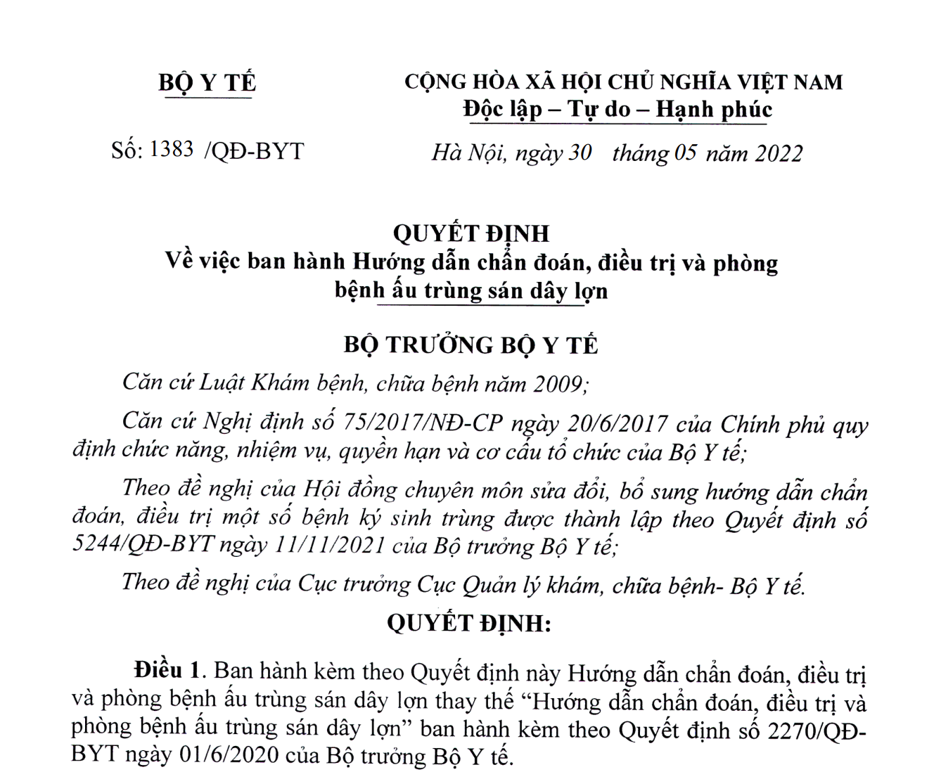 Điều 1. Ban hành kèm theo Quyết định này Hướng dẫn chẩn đoán, điều trị và phòng bệnh ấu trùng sán dây lợn thay thế “Hướng dẫn chẩn đoán, điều trị và phòng bệnh ấu trùng sán dây lợn” ban hành kèm theo Quyết định số 2270/QĐ-BYT ngày 01/6/2020 của Bộ trưởng Bộ Y tế.