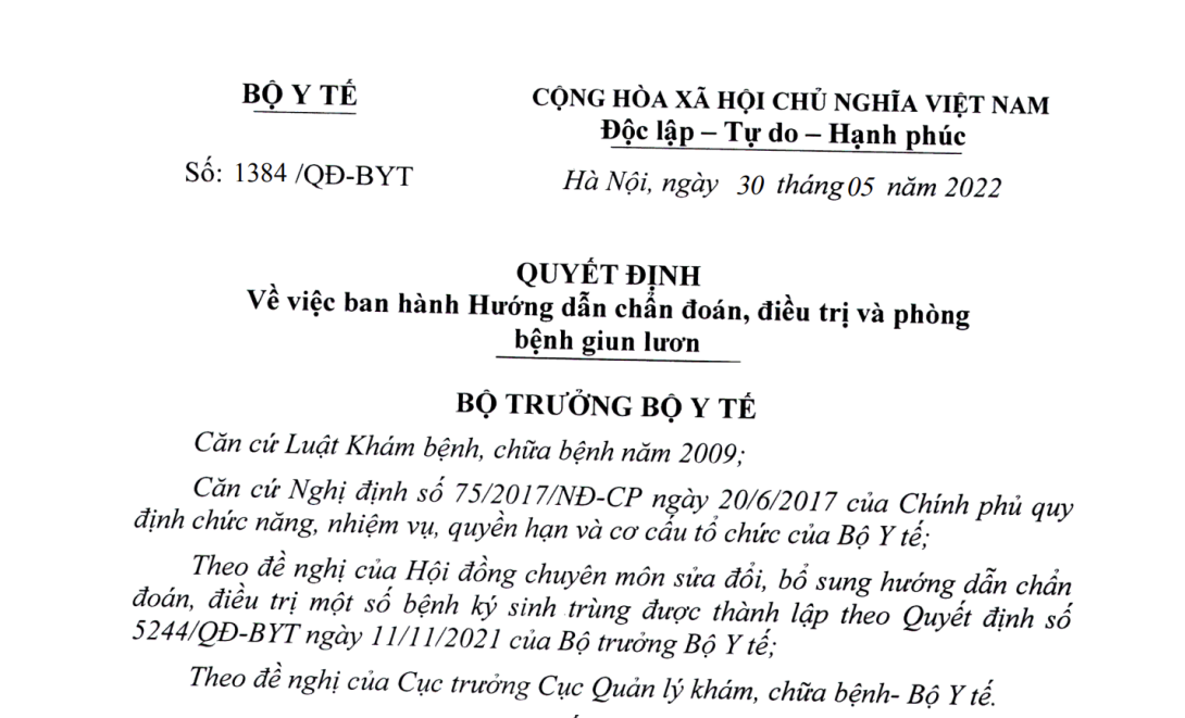 Theo đề nghị của Hội đồng chuyên môn sửa đổi, bổ sung hướng dẫn chẩn đoán, điều trị một số bệnh ký sinh trùng được thành lập theo Quyết định số 5244/QĐ-BYT ngày 11/11/2021 của Bộ trưởng Bộ Y tế;