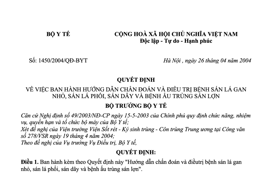 VỀ VIỆC BAN HÀNH HƯỚNG DẪN CHẨN ĐOÁN VÀ ĐIỀU TRỊ BỆNH SÁN LÁ GAN NHỎ, SÁN LÁ PHỔI, SÁN DÂY VÀ BỆNH ẤU TRÙNG SÁN LỢN