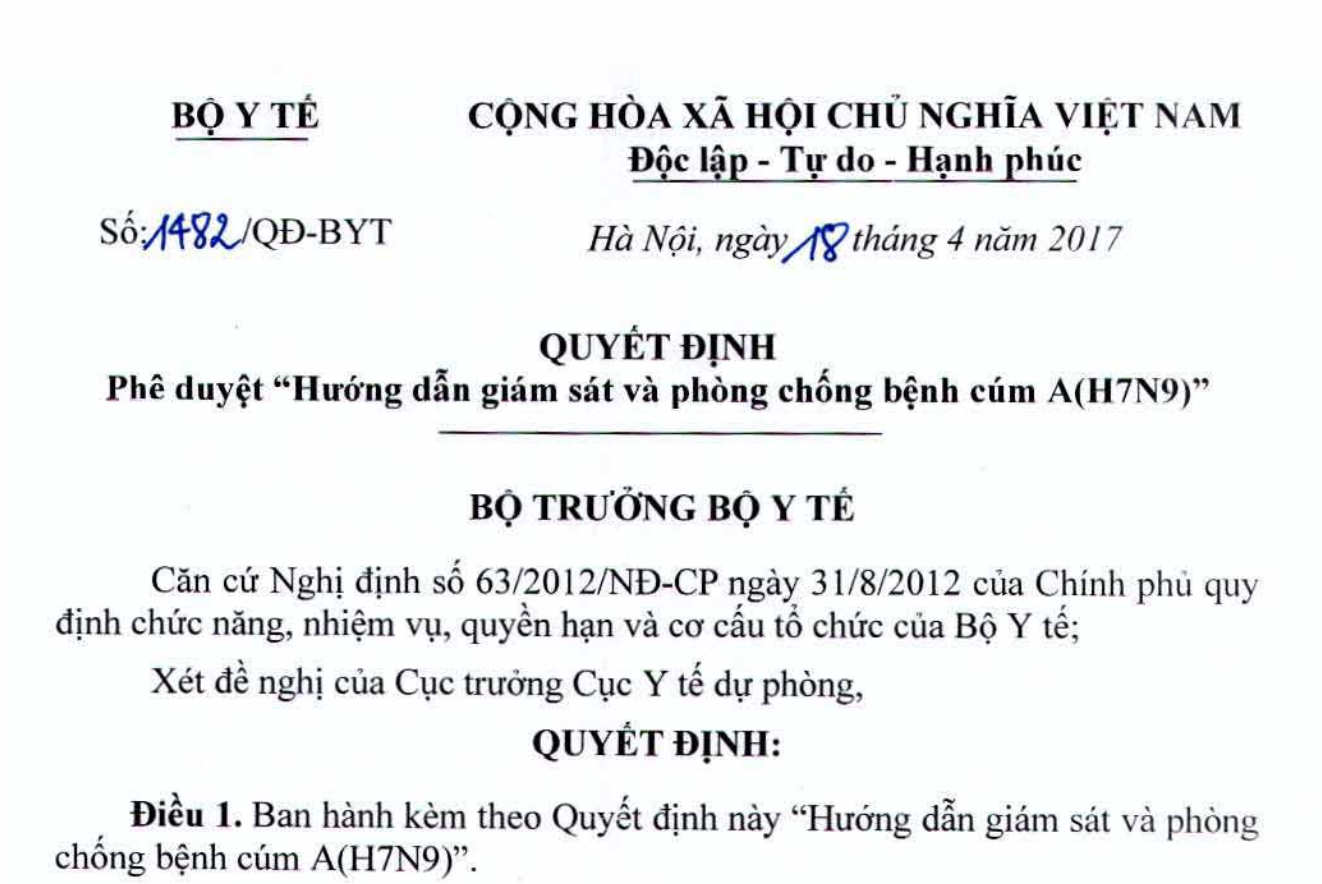 PHÊ DUYỆT “HƯỚNG DẪN GIÁM SÁT VÀ PHÒNG CHỐNG BỆNH CÚM A(H7N9)”