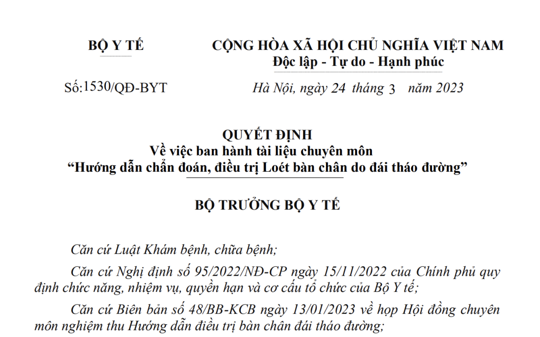 VỀ VIỆC BAN HÀNH TÀI LIỆU CHUYÊN MÔN “HƯỚNG DẪN CHẨN ĐOÁN, ĐIỀU TRỊ LOÉT BÀN CHÂN DO ĐÁI THÁO ĐƯỜNG”