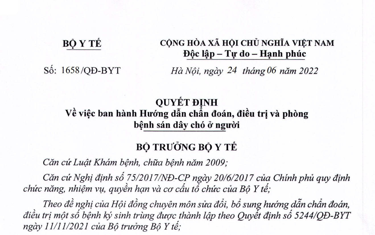 VỀ VIỆC BAN HÀNH HƯỚNG DẪN CHẨN ĐOÁN, ĐIỀU TRỊ VÀ PHÒNG BỆNH SÁN DÂY CHÓ Ở NGƯỜI