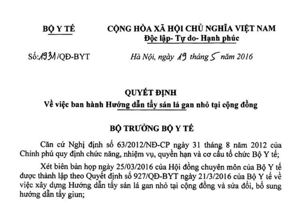 Xét biên bản họp ngày 25/03/2016 của Hội đồng chuyên môn của Bộ Y tế được thành lập theo Quyết định số 927/QĐ-BYT ngày 21/3/2016 của Bộ Y tế về việc xây dựng Hướng dẫn tẩy sán lá gan nhỏ tại cộng đồng và sửa đổi, bổ sung hướng dẫn tẩy giun;