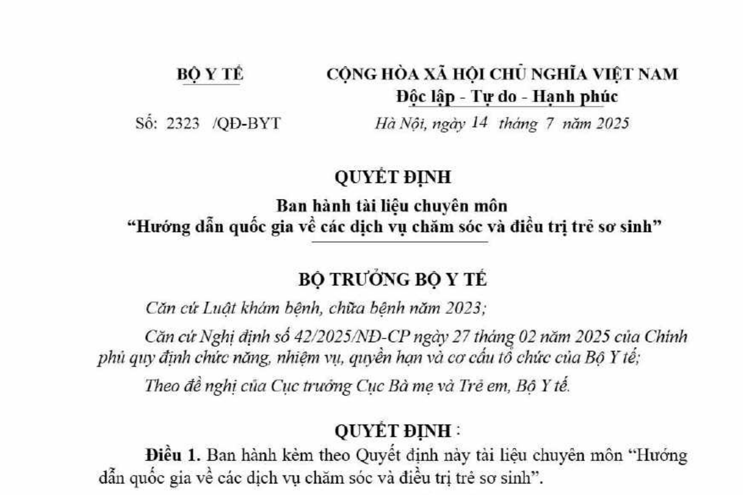 Số: 2323/QĐ-BYT | Hà Nội, ngày 14 tháng 7 năm 2025 |