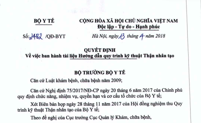 VỀ VIỆC BAN HÀNH TÀI LIỆU HƯỚNG DẪN QUY TRÌNH KỸ THUẬT THẬN NHÂN TẠO