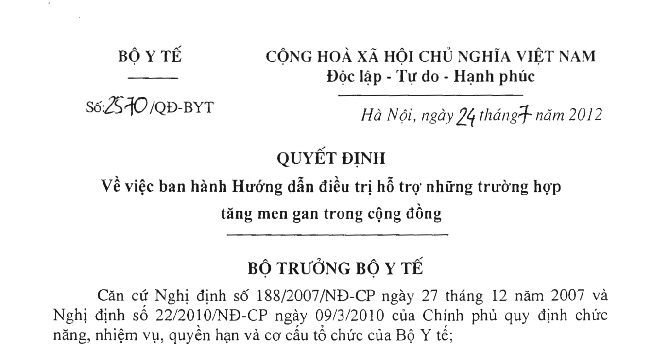 VỀ VIỆC BAN HÀNH HƯỚNG DẪN ĐIỀU TRỊ HỖ TRỢ NHỮNG TRƯỜNG HỢP TĂNG MEN GAN TRONG CỘNG ĐỒNG