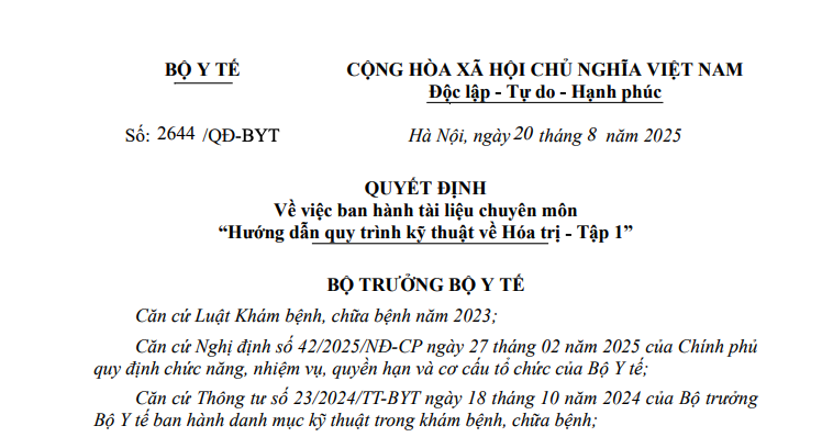 Căn cứ Biên bản họp ngày 18 tháng 05 năm 2025 của Hội đồng chuyên môn nghiệm thu quy trình kỹ thuật về Y học hạt nhân, Hóa trị, Xạ trị và Công văn số 4196/BM-KHTH ngày 03 tháng 7 năm 2025 của Bệnh viện Bạch Mai về việc gửi dự thảo hướng dẫn quy trình kỹ thuật Hóa trị đã được Chủ tịch Hội đồng chuyên môn nghiệm thu duyệt dự thảo;