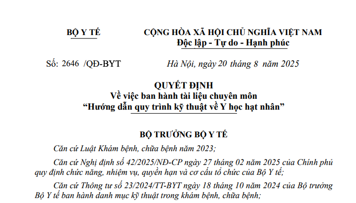 Căn cứ Biên bản họp ngày 18 tháng 05 năm 2025 của Hội đồng chuyên môn nghiệm thu quy trình kỹ thuật về Y học hạt nhân, Hóa trị, Xạ trị và Công văn số 4196/BM-KHTH ngày 03 tháng 7 năm 2025 của Bệnh viện Bạch Mai gửi dự thảo quy trình kỹ thuật về Y học hạt nhân đã được Chủ tịch Hội đồng chuyên môn nghiệm thu duyệt dự thảo;