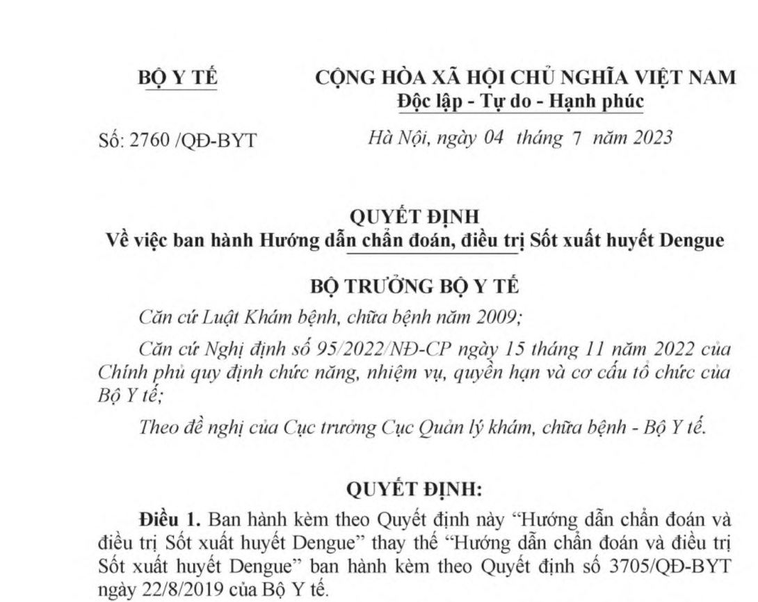 VỀ VIỆC BAN HÀNH HƯỚNG DẪN CHẨN ĐOÁN, ĐIỀU TRỊ SỐT XUẤT HUYẾT DENGUE