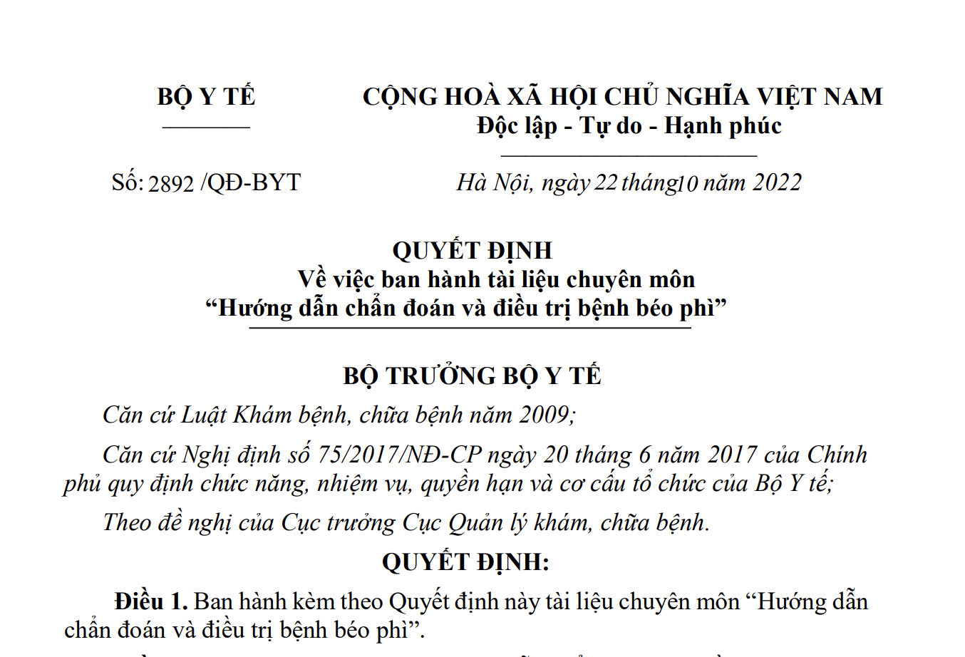 Số: 2892/QĐ-BYT | Hà Nội, ngày 22 tháng 10 năm 2022 |