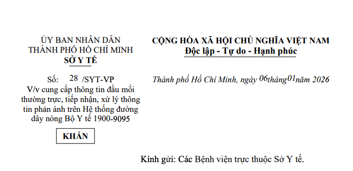 Công văn của Sở Y tế Thành phố Hồ Chí Minh về việc cung cấp thông tin đầu mối thường trực, tiếp nhận và xử lý phản ánh trên Hệ thống đường dây nóng Bộ Y tế 1900-9095 là văn bản hành chính khẩn, gửi đến các bệnh viện trực thuộc Sở Y tế .