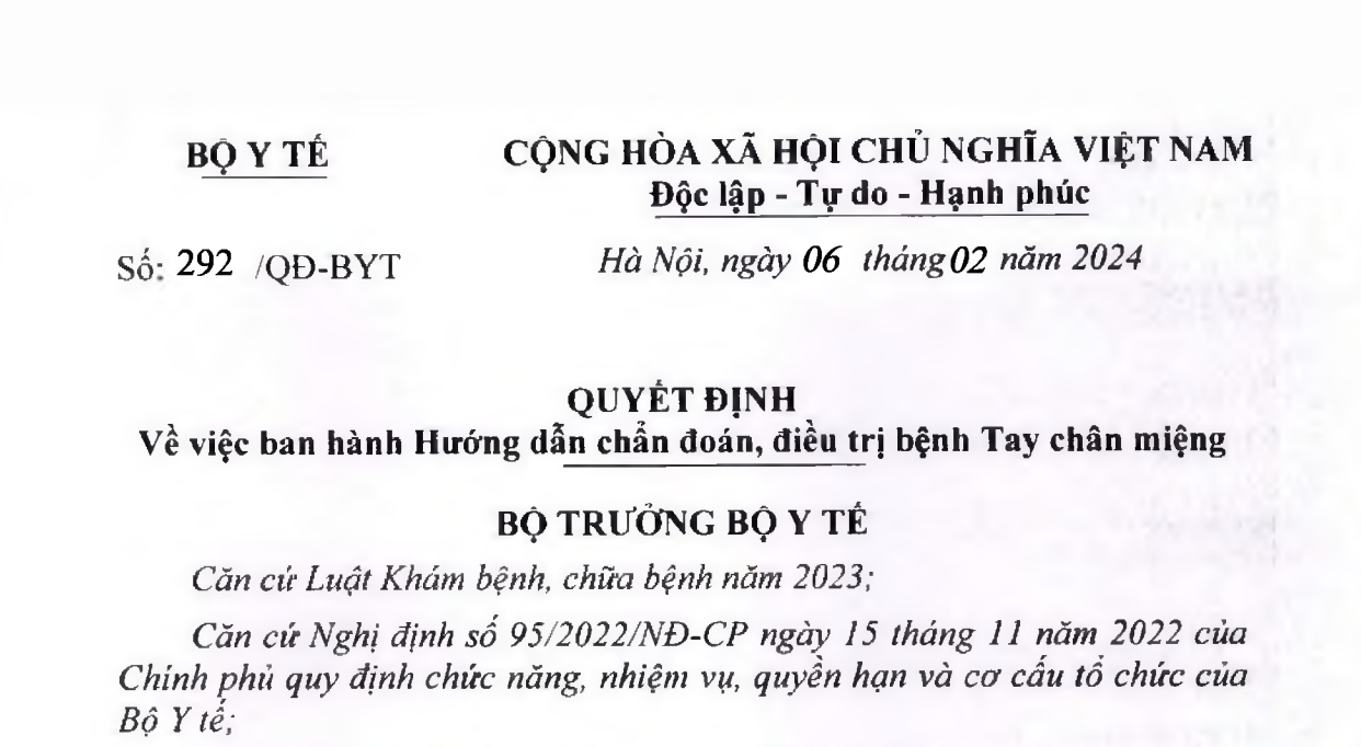 VỀ VIỆC BAN HÀNH HƯỚNG DẪN CHẨN ĐOÁN, ĐIỀU TRỊ BỆNH TAY CHÂN MIỆNG