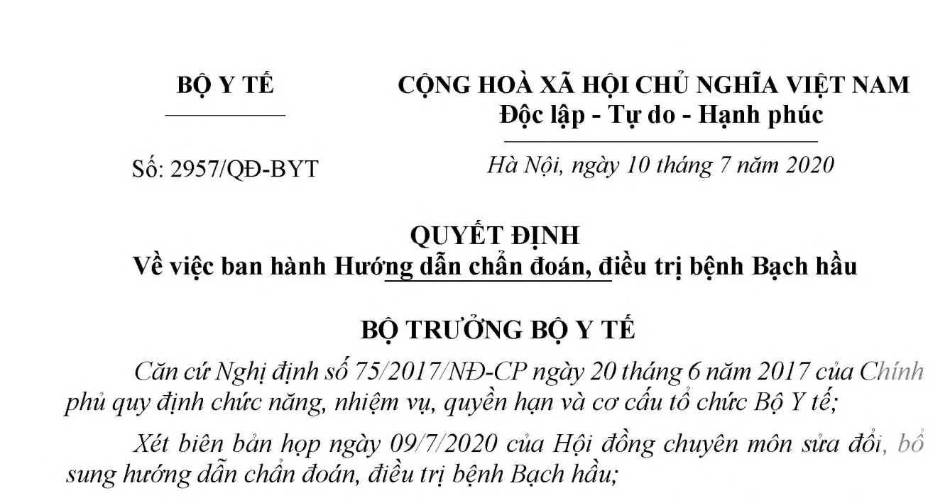 VỀ VIỆC BAN HÀNH HƯỚNG DẪN CHẨN ĐOÁN, ĐIỀU TRỊ BỆNH BẠCH HẦU