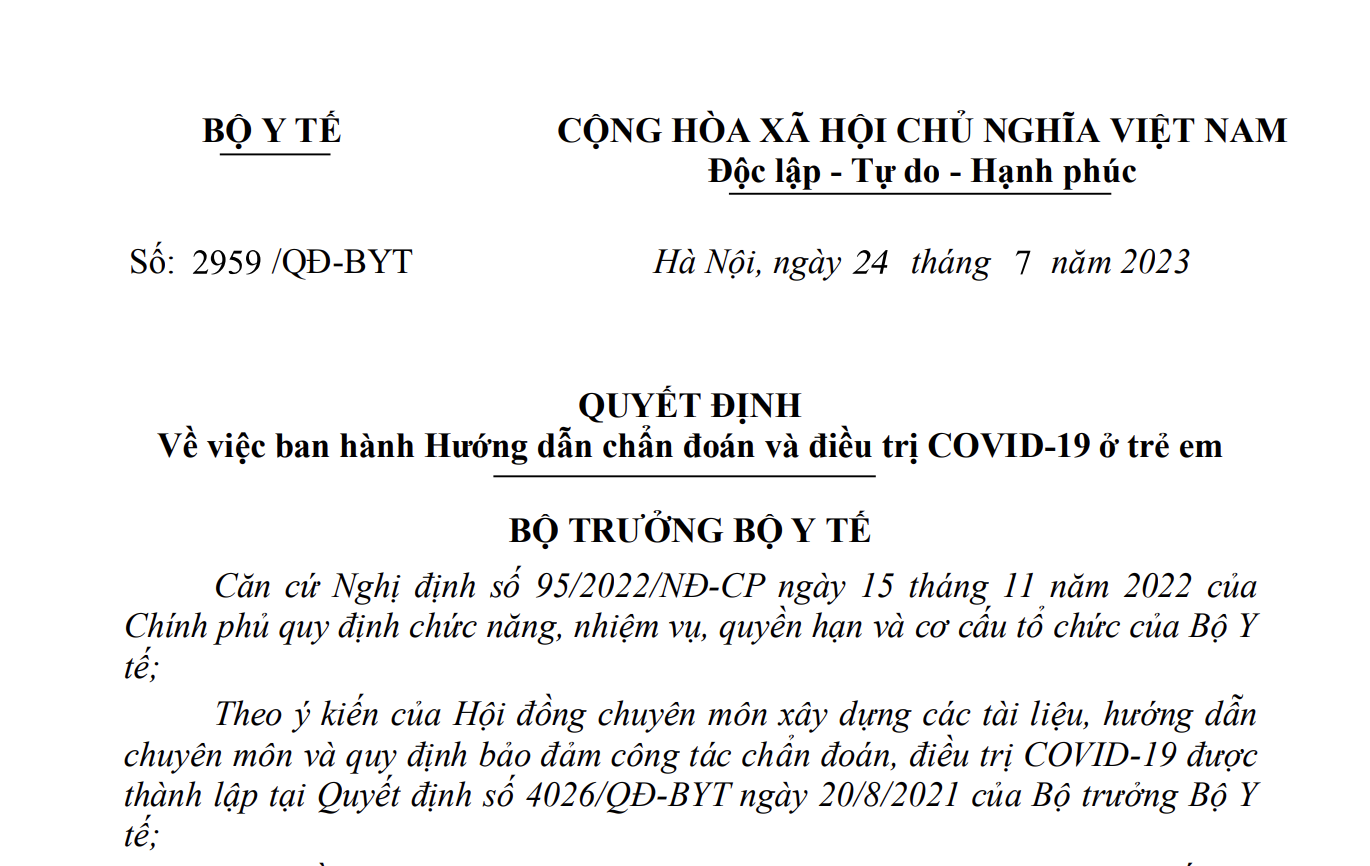 Quyết định 2959/QĐ-BYT ngày 24/07/2023 về Hướng dẫn chẩn đoán và điều trị COVID-19 ở trẻ em do Bộ trưởng Bộ Y tế ban hành