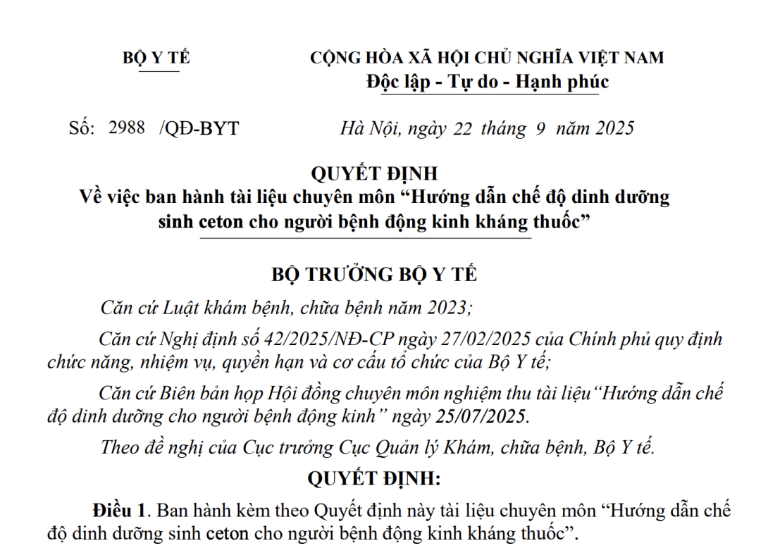 Quyết định 2988/QĐ-BYT ngày 22/09/2025 về Tài liệu chuyên môn “Hướng dẫn chế độ dinh dưỡng sinh ceton cho người bệnh động kinh kháng thuốc” do Bộ trưởng Bộ Y tế ban hành