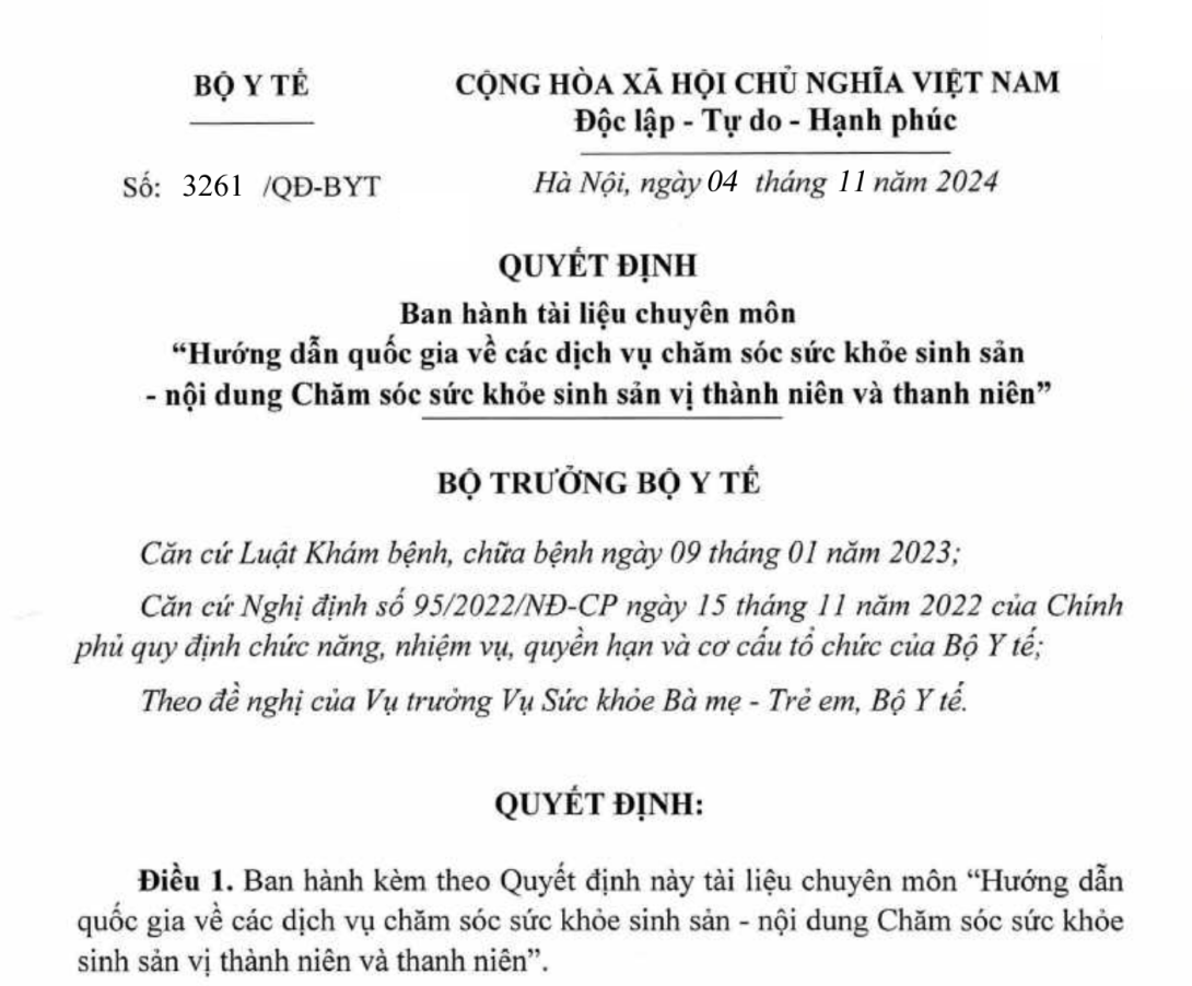 BAN HÀNH TÀI LIỆU CHUYÊN MÔN “HƯỚNG DẪN QUỐC GIA VỀ CÁC DỊCH VỤ CHĂM SÓC SỨC KHỎE SINH SẢN - NỘI DUNG CHĂM SÓC SỨC KHỎE SINH SẢN VỊ THÀNH NIÊN VÀ THANH NIÊN”