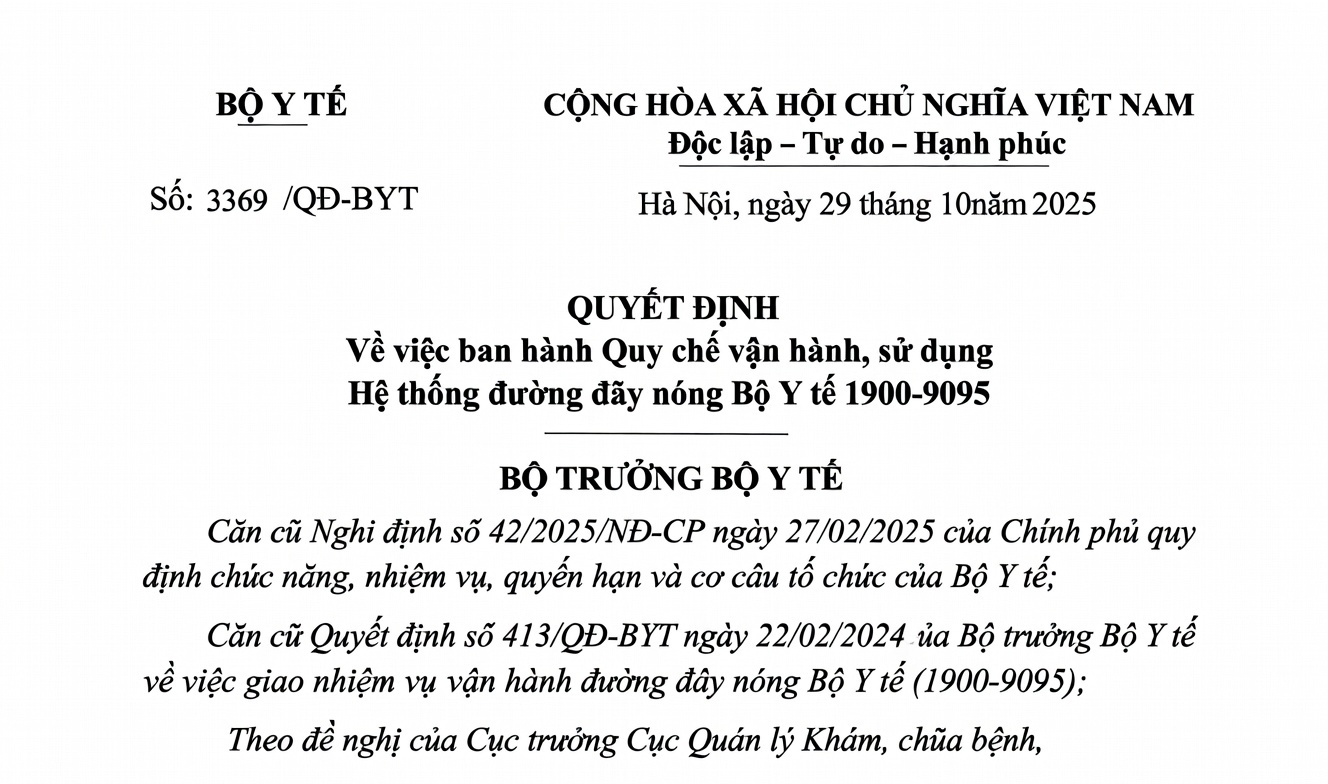 Quyết định của Bộ trưởng Bộ Y tế về việc ban hành Quy chế vận hành, sử dụng Hệ thống đường dây nóng Bộ Y tế 1900-9095 là văn bản quy phạm nội bộ quy định toàn diện cơ chế tổ chức, vận hành và quản lý hệ thống tiếp nhận – xử lý phản ánh của người dân trong lĩnh vực y tế .