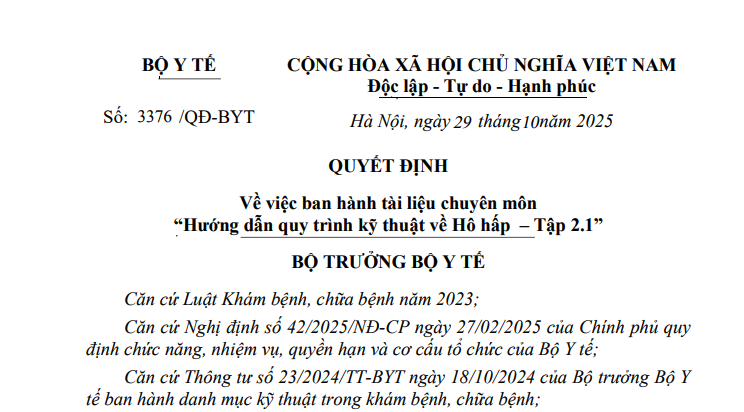 Căn cứ Biên bản họp ngày 21 tháng 05 năm 2025 của Hội đồng chuyên môn nghiệm thu quy trình kỹ thuật về Hô hấp (hệ nội) và Công văn số 4698/BM-KHTH ngày 21 tháng 7 năm 2025 của Bệnh viện Bạch Mai về việc gửi dự thảo hướng dẫn quy trình kỹ thuật về hô hấp đã được Chủ tịch Hội đồng chuyên môn nghiệm thu duyệt dự thảo;
