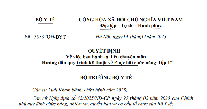 VỀ VIỆC BAN HÀNH TÀI LIỆU CHUYÊN MÔN “HƯỚNG DẪN QUY TRÌNH KỸ THUẬT VỀ PHỤC HỒI CHỨC NĂNG-TẬP 1”