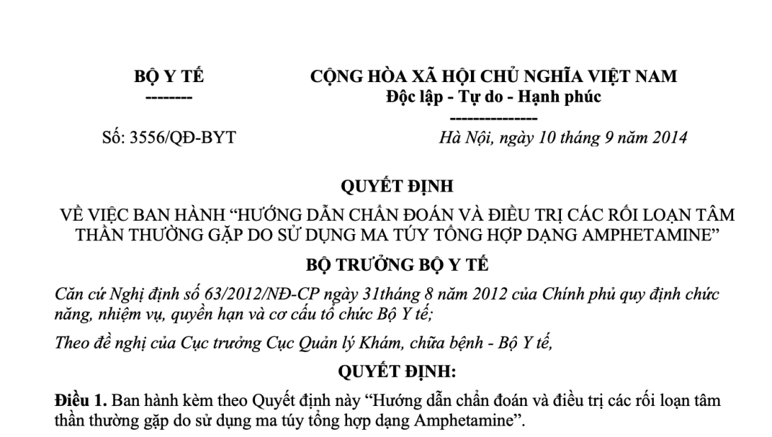 VỀ VIỆC BAN HÀNH “HƯỚNG DẪN CHẨN ĐOÁN VÀ ĐIỀU TRỊ CÁC RỐI LOẠN TÂM THẦN THƯỜNG GẶP DO SỬ DỤNG MA TÚY TỔNG HỢP DẠNG AMPHETAMINE”