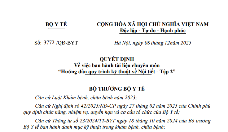 Căn cứ Biên bản họp ngày 10 tháng 06 năm 2025 của Hội đồng chuyên môn nghiệm thu quy trình kỹ thuật về Nội tiết và Công văn số 1448/BVNTTW ngày 17 tháng 10 năm 2025 của Bệnh viện Nội tiết Trung ương về việc gửi dự thảo hướng dẫn quy trình kỹ thuật về Nội tiết;