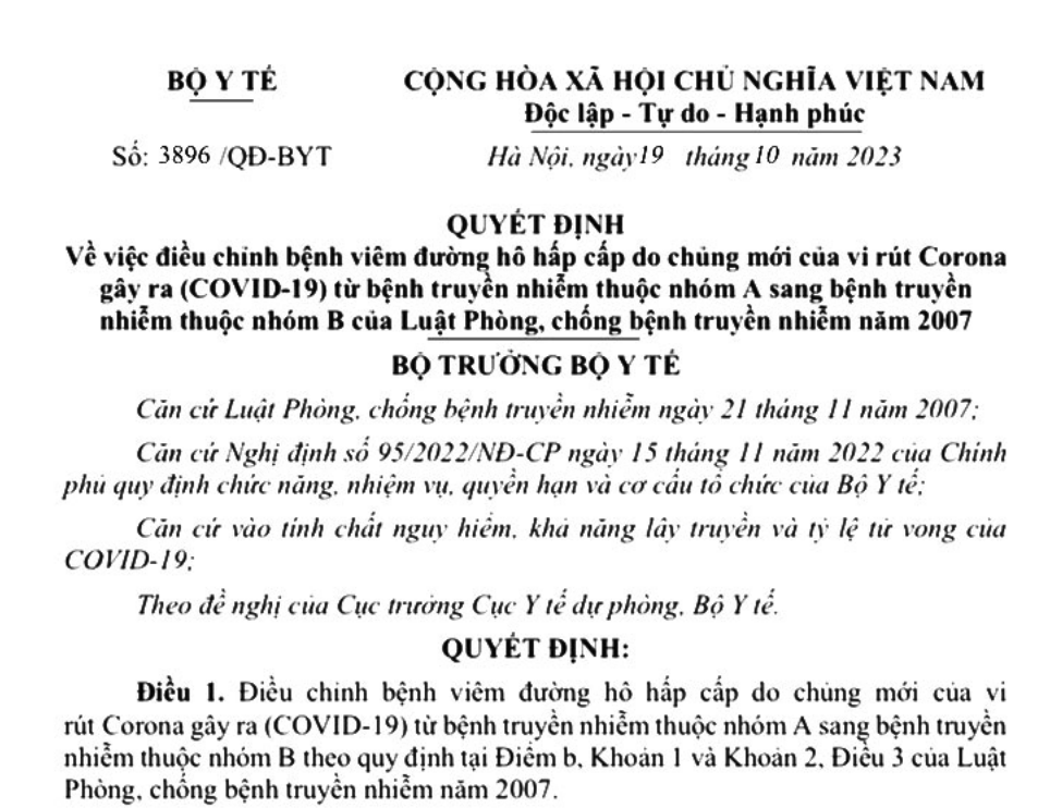 VỀ VIỆC ĐIỀU CHỈNH BỆNH VIÊM ĐƯỜNG HÔ HẤP CẤP DO CHỦNG MỚI CỦA VI RÚT CORONA GÂY RA (COVID-19) TỪ BỆNH TRUYỀN NHIỄM THUỘC NHÓM A SANG BỆNH TRUYỀN NHIỄM THUỘC NHÓM B CỦA LUẬT PHÒNG, CHỐNG BỆNH TRUYỀN NHIỄM NĂM 2007