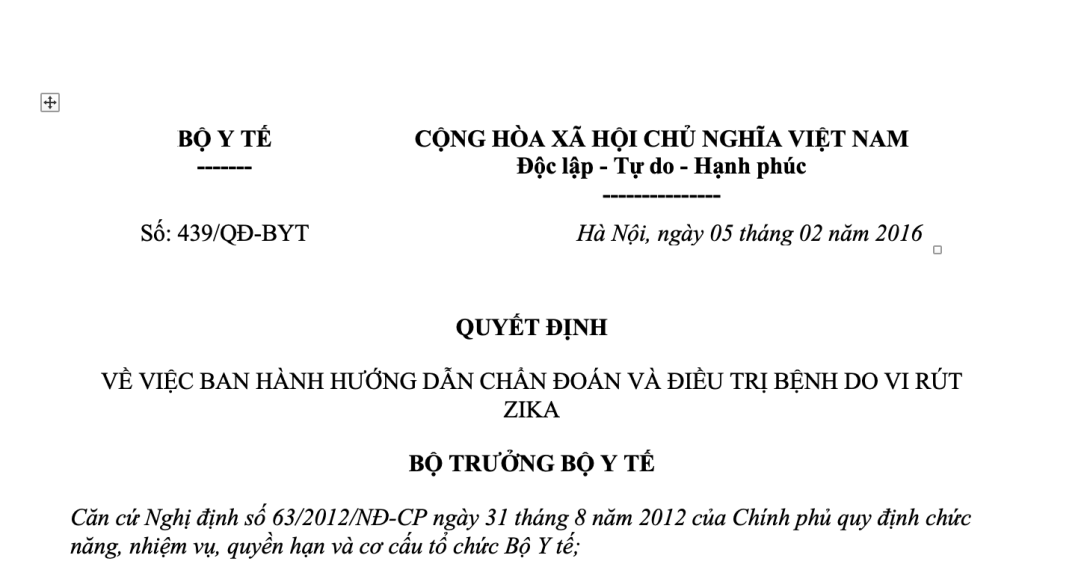 VỀ VIỆC BAN HÀNH HƯỚNG DẪN CHẨN ĐOÁN VÀ ĐIỀU TRỊ BỆNH DO VI RÚT ZIKA