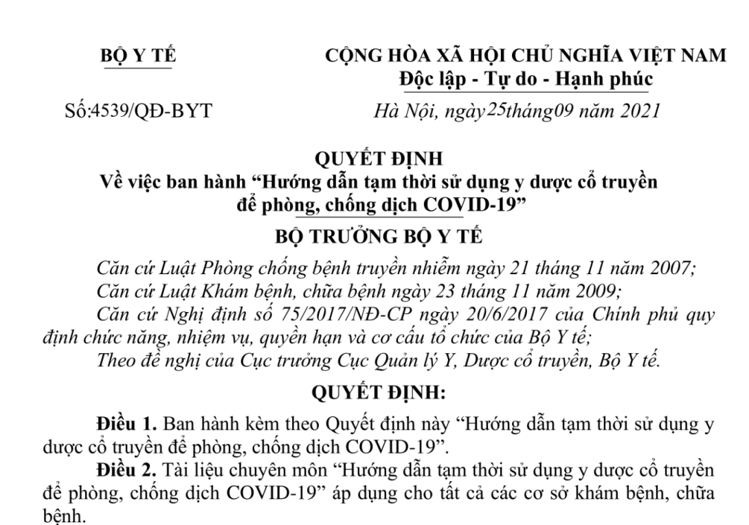 VỀ VIỆC BAN HÀNH “HƯỚNG DẪN TẠM THỜI SỬ DỤNG Y DƯỢC CỔ TRUYỀN ĐỂ PHÒNG, CHỐNG DỊCH COVID-19”