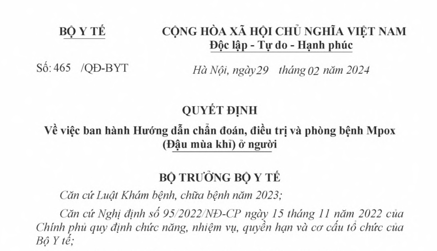 VỀ VIỆC BAN HÀNH HƯỚNG DẪN CHẨN ĐOÁN, ĐIỀU TRỊ VÀ PHÒNG BỆNH MPOX (ĐẬU MÙA KHỈ) Ở NGƯỜI