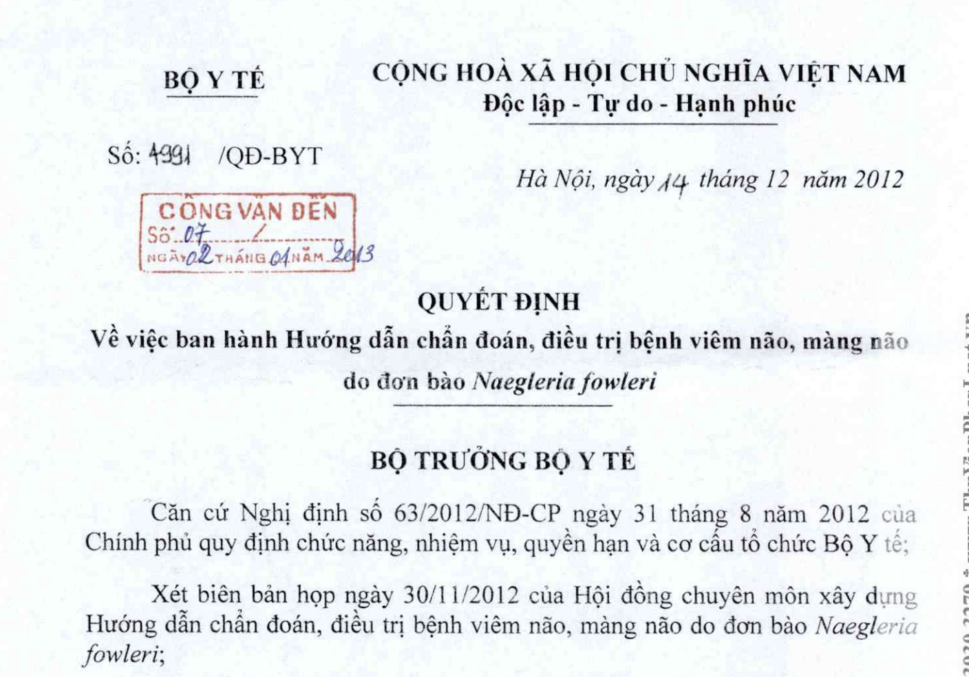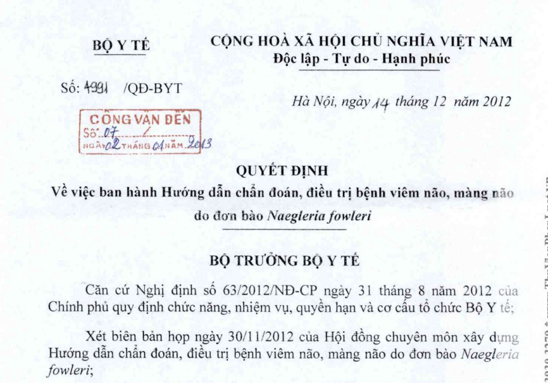 VỀ VIỆC BAN HÀNH HƯỚNG DẪN CHẨN ĐOÁN ĐIỀU TRỊ BỆNH VIÊM NÃO, MÀNG NÃO DO ĐƠN BÀO NAEGLERIA FOWLERI