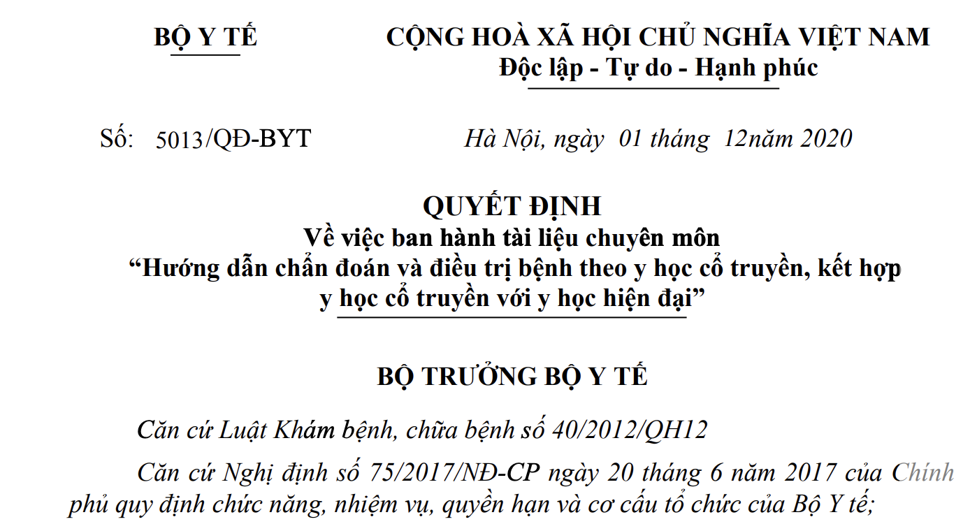 VỀ VIỆC BAN HÀNH TÀI LIỆU CHUYÊN MÔN “HƯỚNG DẪN CHẨN ĐOÁN VÀ ĐIỀU TRỊ BỆNH THEO Y HỌC CỔ TRUYỀN, KẾT HỢP Y HỌC CỔ TRUYỀN VỚI Y HỌC HIỆN ĐẠI”