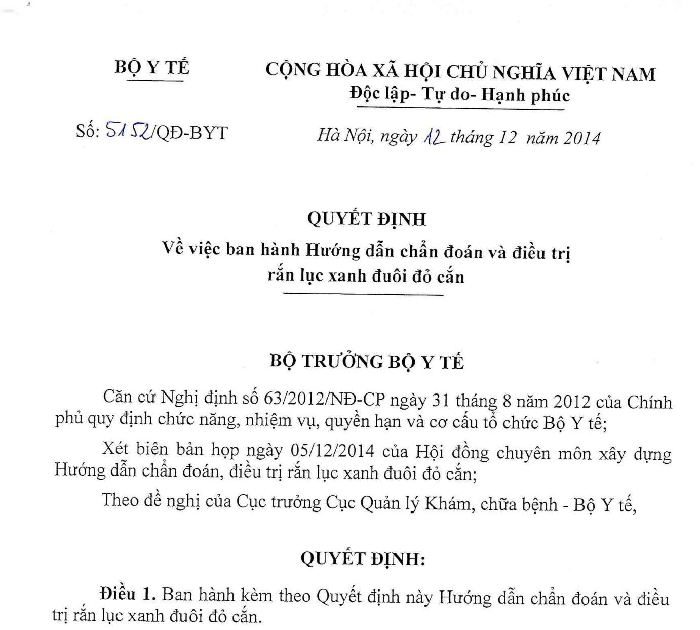 Điều 1. Ban hành kèm theo Quyết định này Hướng dẫn chẩn đoán và điều trị rắn lục xanh đuôi đỏ cắn.