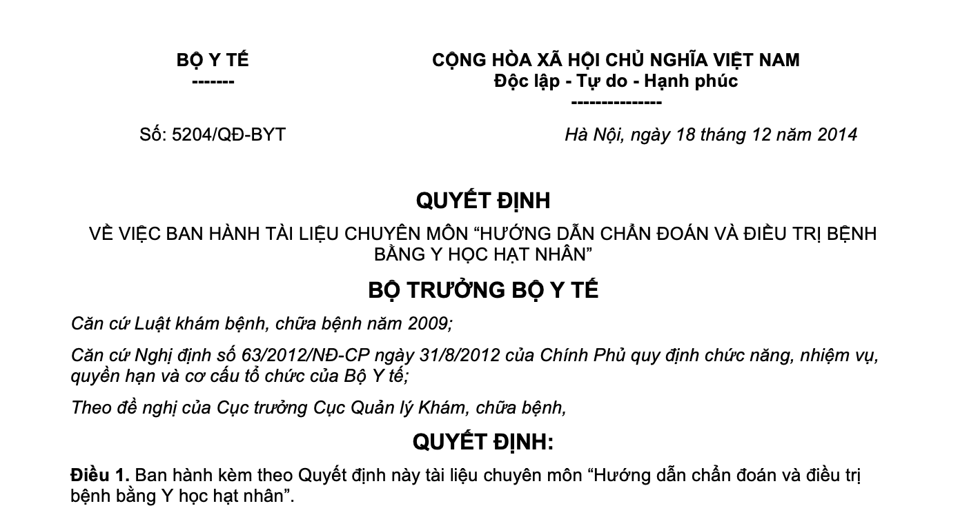 VỀ VIỆC BAN HÀNH TÀI LIỆU CHUYÊN MÔN “HƯỚNG DẪN CHẨN ĐOÁN VÀ ĐIỀU TRỊ BỆNH BẰNG Y HỌC HẠT NHÂN”