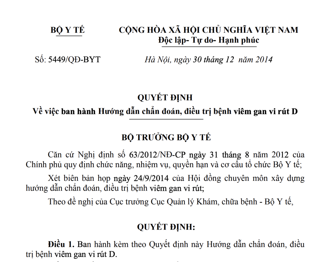 VỀ VIỆC BAN HÀNH HƯỚNG DẪN CHẨN ĐOÁN, ĐIỀU TRỊ BỆNH VIÊM GAN VI RÚT D