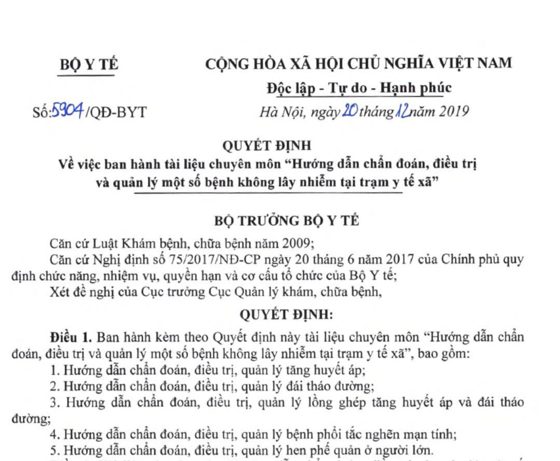 VỀ VIỆC BAN HÀNH TÀI LIỆU CHUYÊN MÔN “HƯỚNG DẪN CHẨN ĐOÁN, ĐIỀU TRỊ VÀ QUẢN LÝ MỘT SỐ BỆNH KHÔNG LÂY NHIỄM TẠI TRẠM Y TẾ XÔ