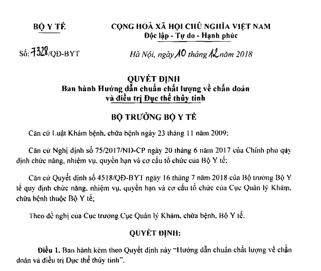 BAN HÀNH HƯỚNG DẪN CHUẨN CHẤT LƯỢNG VỀ CHẨN ĐOÁN VÀ ĐIỀU TRỊ ĐỤC THỂ THỦY TINH