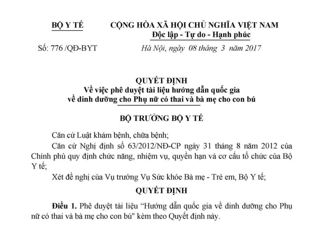VỀ VIỆC PHÊ DUYỆT TÀI LIỆU HƯỚNG DẪN QUỐC GIA VỀ DINH DƯỠNG CHO PHỤ NỮ CÓ THAI VÀ BÀ MẸ CHO CON BÚ